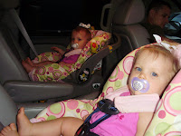 Dad fed the babies strawberry cake, which they loved. I love the picture of Kalee looking up at him with that grin on her face! It was as if she were saying, "Thanks Pa!" They were exhausted from church because they did not nap so they slept in their car seats for a little while. I hope this is one of the lasts pictures I have of these car seats. I got their new ones in last week. :) I had my dad load one for me because they are so heavy. He said that he didn't know how I carried them! 22 lbs and the car seat weight is a good work out!